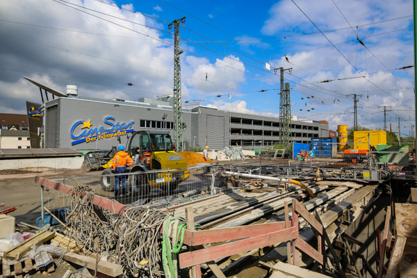 Dann wird die Baustelle im Bereich der DB-Gleise im Mai 2017 mit dem Portalkran frei geräumt, damit der Umbau der DB-Verkehrsstation dort mit vorlaufenden Arbeiten beginnen kann. Dafür werden auch die Gleisanlagen im Mai/Juni 2017 zurückgebaut. Es folgen dann aber noch weitere Rohbauarbeiten wie beispielsweise Betonsanierung oder Beiputzarbeiten.