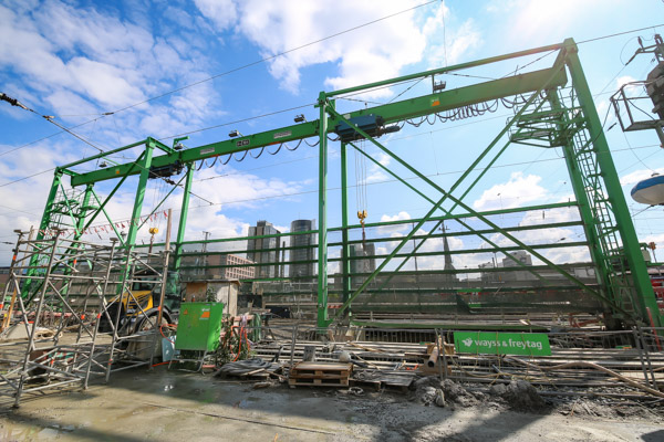 Die große Herausforderung dabei: Nur 2,50 Meter darüber fahren auf den DB-Gleisen täglich über 1.000 Züge. Alle Arbeiten wurden und werden deshalb auch mit einem vollautomatischen Überwachungssystem mit Alarmfunktion überwacht.