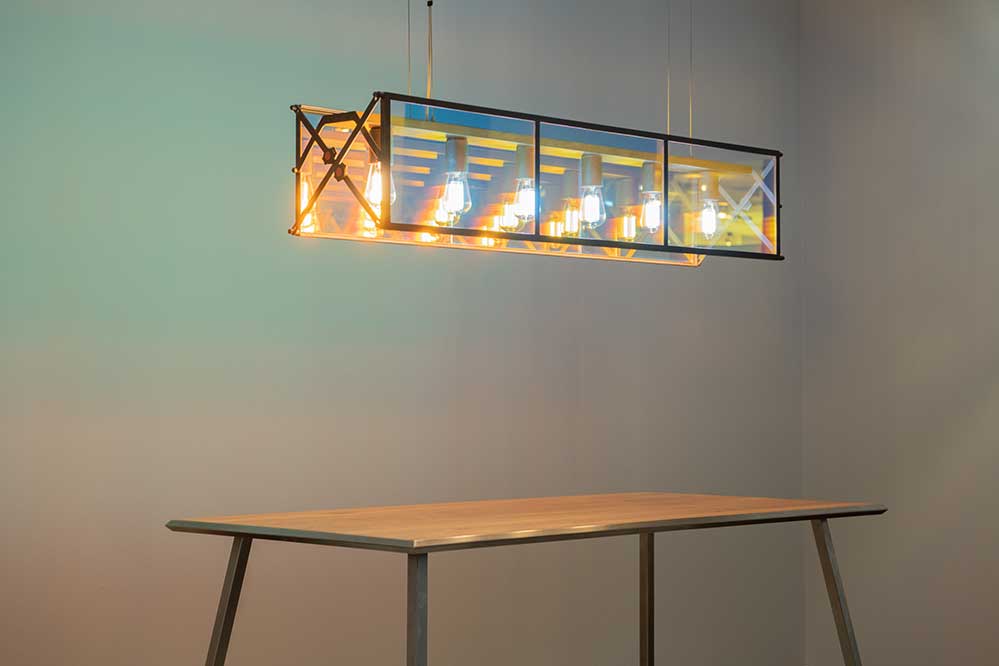 Die vier Schmuckstücke für die Wand können durch eine Drehung in Bewegung versetzt werden. Im Gitterkorpus angebrachte Glasflügel setzen das Objekt durch Lichtbrechung, Spiegelung und einen Farbwechsel effektvoll in Szene.