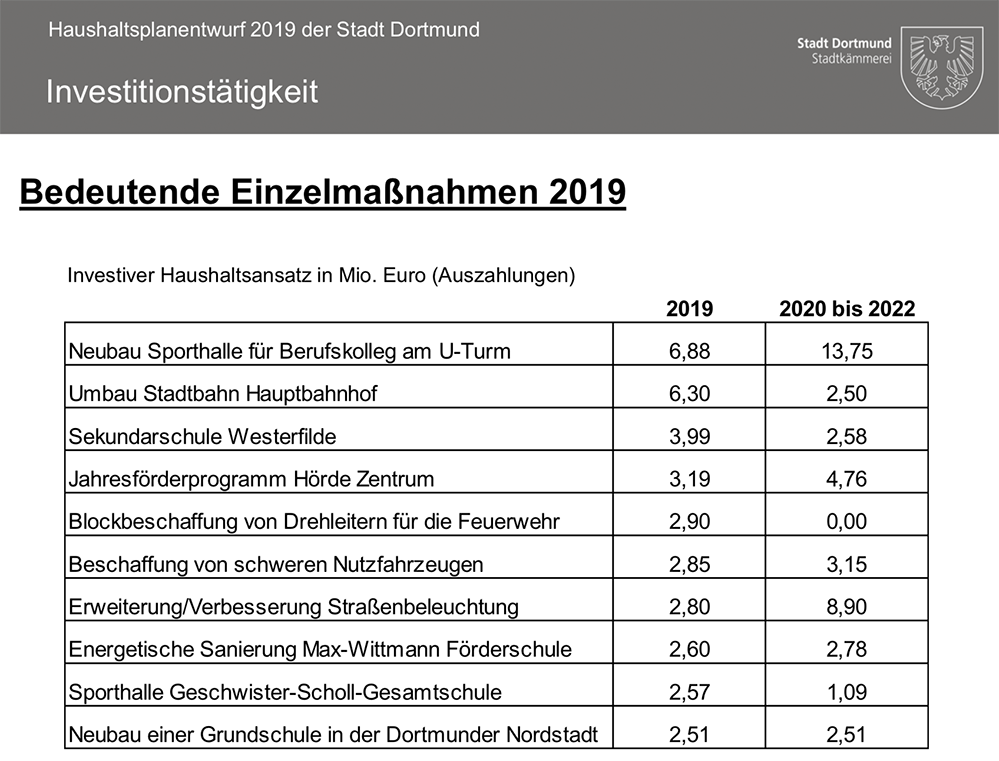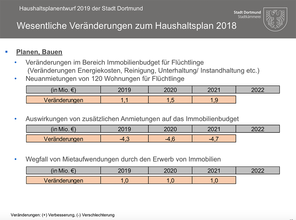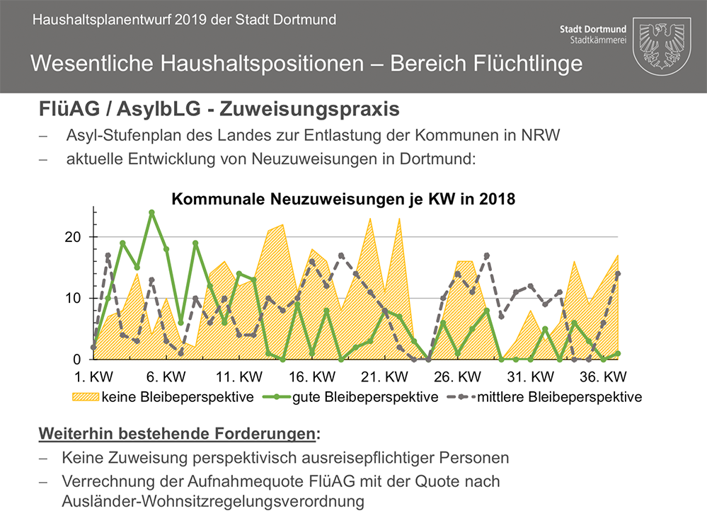 Wenn man alle Positionen addiere, lägen die nicht durchfinanzierten Leistungen bei weit über 100 Millionen Euro – allein in Dortmund. Auf 30 Millionen Euro beziffert die Stadt das Flüchtlingsthema, die Folgen der Zuwanderung aus Südosteuropa auf 15 Millionen, den Einheitslastenausgleich Deutsche Einheit auf 27 Millionen.