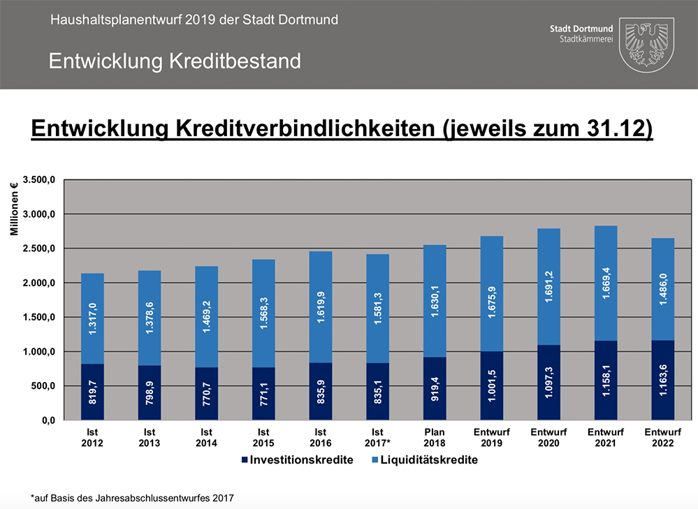 Ohne diese Positionen hätte Dortmund einen ausgeglichenen Haushalt. Für Stüdemann ist es widersinnig, dass West-Kommunen die Lasten der Einheit über Kredite finanzieren und über Jahrzehnte abarbeiten müssten, wobei die Geldflüsse – mit Blick auf den Investitionsbedarf gesehen – ganz anders gelenkt werden müssten.