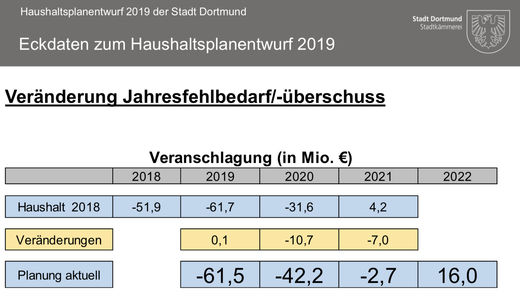 Auch wenn der Haushaltsausgleich abermals nicht erreicht wird, zeichnet sich der neue Haushaltsplan durch eine deutliche Entspannung im Vergleich zu den Vorjahren aus.