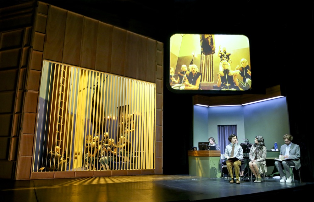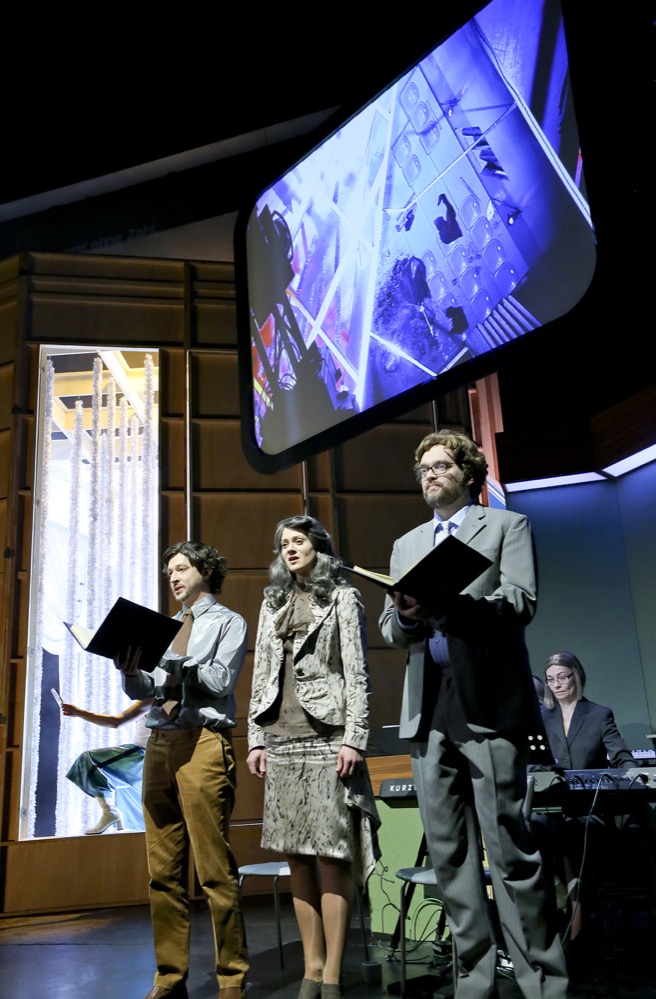 Sie reisen durch die Zeiten der Evolution in der Fibonacci-Spirale des Bühnenbildes von Auerbach. Im ersten Kostüm in der Spirale, welche die Evolution versinnbildlichen soll, beginnen die Schauspieler als Affenmenschen verkleidet, Geschlecht unerkennbar, auf Schreibmaschinen Texte ein zu hämmern, um sich anschließend vor Publikum zu duschen und umzuziehen. Die folgenden Kostüme, aus der Zeit der Entstehung des Oratoriums, lassen die Schauspieler geschlechtslos und doll-drastisch in roboterhaften Gesten erscheinen und ein gesellschaftliches Zerrbild entstehen.