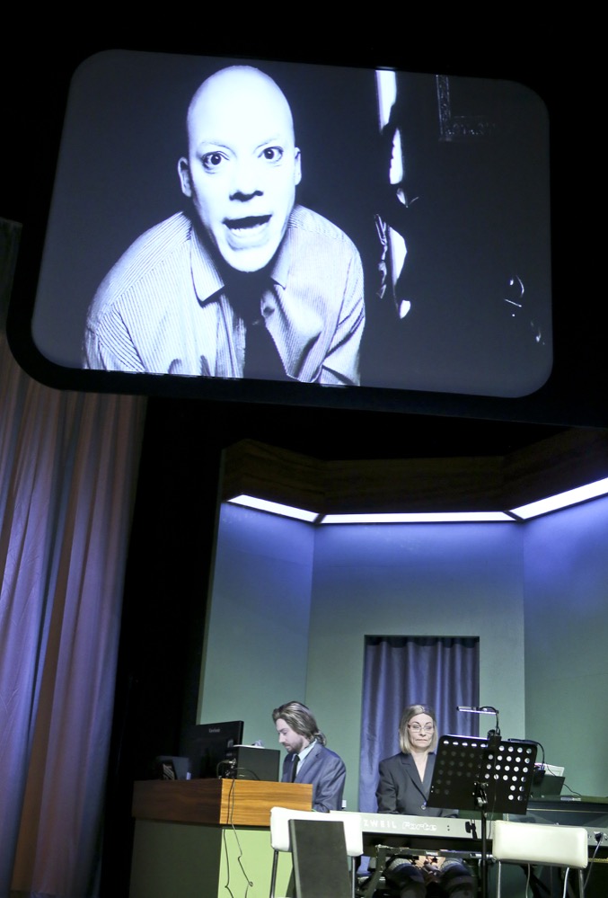 Cyborgs ähnlich, fahren die Schauspieler auf die Bühne, während sich noch der Dampf der Ursuppe im Bühnenbild bewegt. Ihre Texte auf den ersten Blick ein Wirrwarr, der sich bei genauerem Hinhören als Vorstellung der Mensch-Maschine entpuppt. Sie haben keine Pronomen, keine Gesichter, sondern Masken, sind zugleich auf der Bühne und in den Terminals, sind Abstraktionen von Menschen, welche sie geschaffen haben.