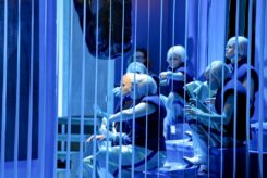 Gesteuert von Vernunft und Individualismus – besonders eindringlich zu erleben in der Kakophonie im Bild des sechsten Tages. Rauschhaft wabert die Musik, untermalt von sich wiederholenden Sätzen von scheinbar schicksalhaftem und belanglosem – moderner Kommunikationsmüll. Schöpfung „ad absurdum“ oder Irrweg der menschlichen Schöpfung? Die Masken geben dem Zuschauer einen Hinweis auf den Robo Sapiens – denn längst sind wir zu Bedienelementen unserer elektronischen Helfer degeneriert.