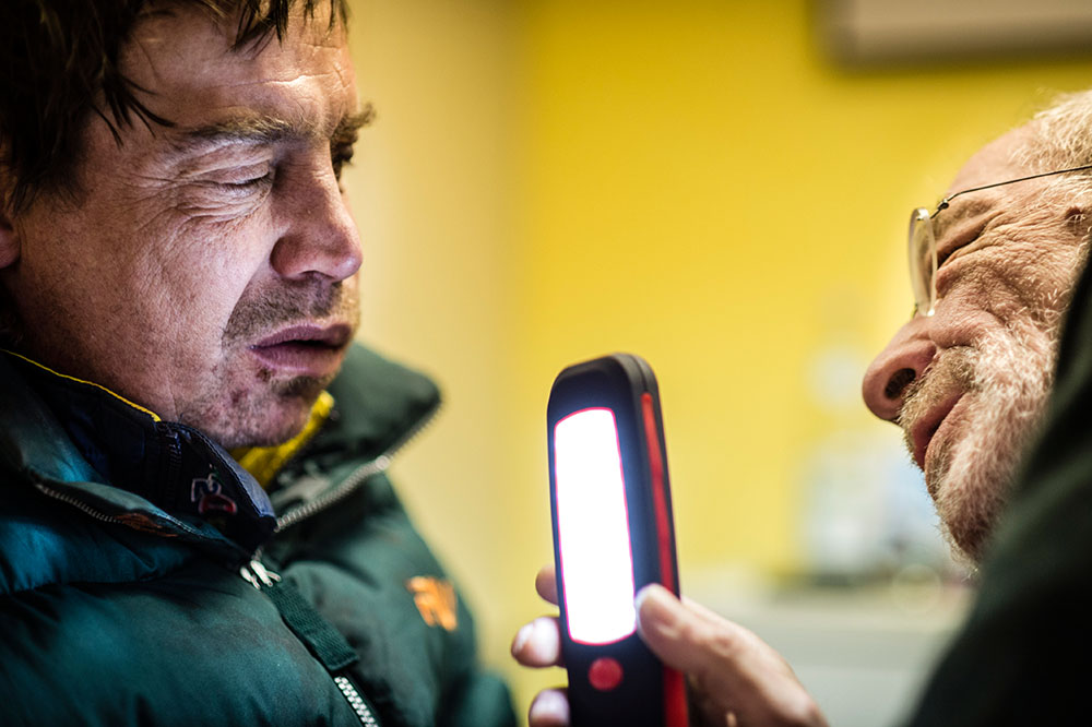 Der Arzt Martin Müller untersucht eine Gesichtsverletzung. Foto: Andreas Hub