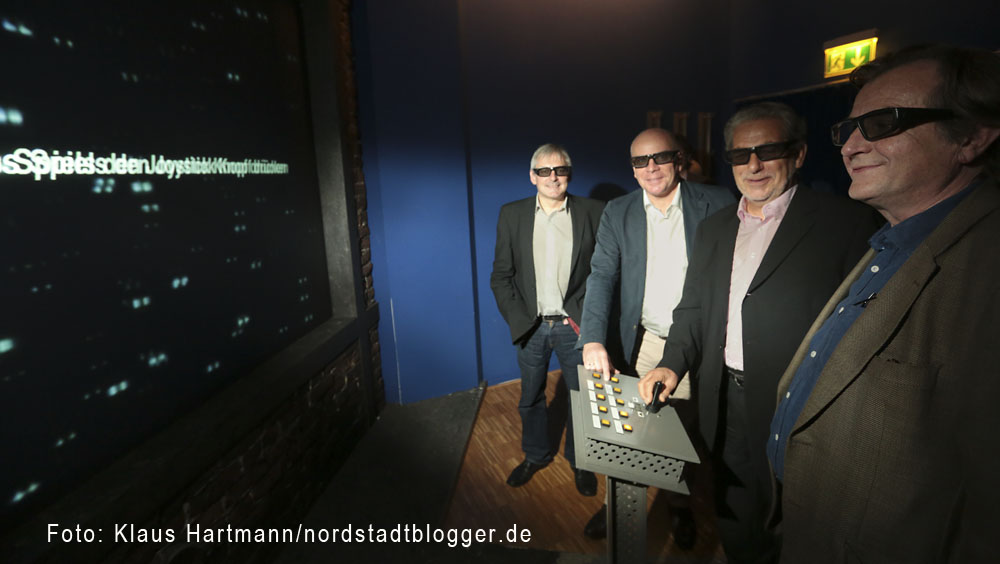 Hoesch-Museum stellt 3-Modul vor. Im Raum mit der 3D-Installation: v. l.: Michael Dückershoff, Kurator Hoesch-Museum; Dr. Karl-Peter Ellerbrock, Hoesch-Museum, Franz-Josef Kniola, NRW-Stiftung und Gerhard Herr, Projektleiter