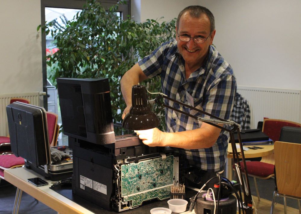 Die Ehrenamtlichen sind freiwillige Expert:innen, die gemeinsam mit den Besitzer:innen an den Geräten arbeiten. Das Repair-Café findet einmal im Monat statt. Jedes Gerät bringe eine neue Herausforderung und so lerne man immer was dazu, sagt einer der Experten, Volker Stirba.