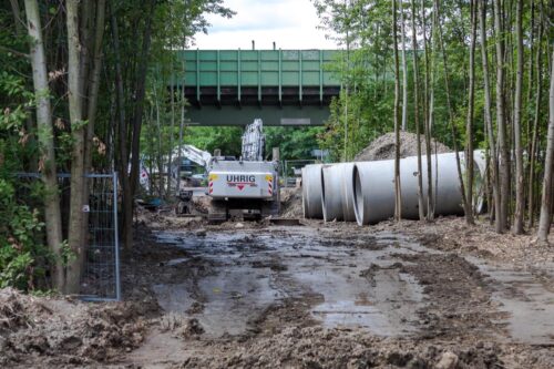 Im Norden Dortmunds, östlich des Freibades Stockheide, zwischen der ehemaligen Westfalenhütte und dem Bundesbahngelände, entsteht im Auftrag der Stadtentwässerung Dortmund eine ca. 500 Meter lange Entwässerungsleitung mit Durchmessern zwischen einem und zwei Metern. Die Leitung dient zur Abführung des anfallenden Regenwassers aus den städtischen Erschließungsflächen im Bereich „Nordspange“ sowie des Logistikparks der Firma Garbe Logistic AG zur Körne. Sascha Rotermund hat mit der Kamera und einer Drohne die Baustelle dokumentiert. Hier sind seine Impressionen.