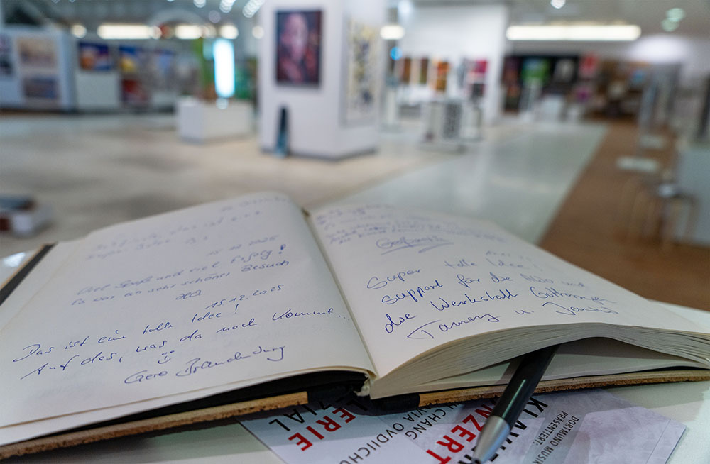 Sie sehen sich die Arbeiten der mehr als 20 Künstler*innen an, kaufen das ein oder andere Werk und äußern sich lobend über diese Idee der Wintergalerie im Gästebuch, das ausliegt und angesichts der vielen Kommentare schon bald durch ein zweites ersetzt werden muss.