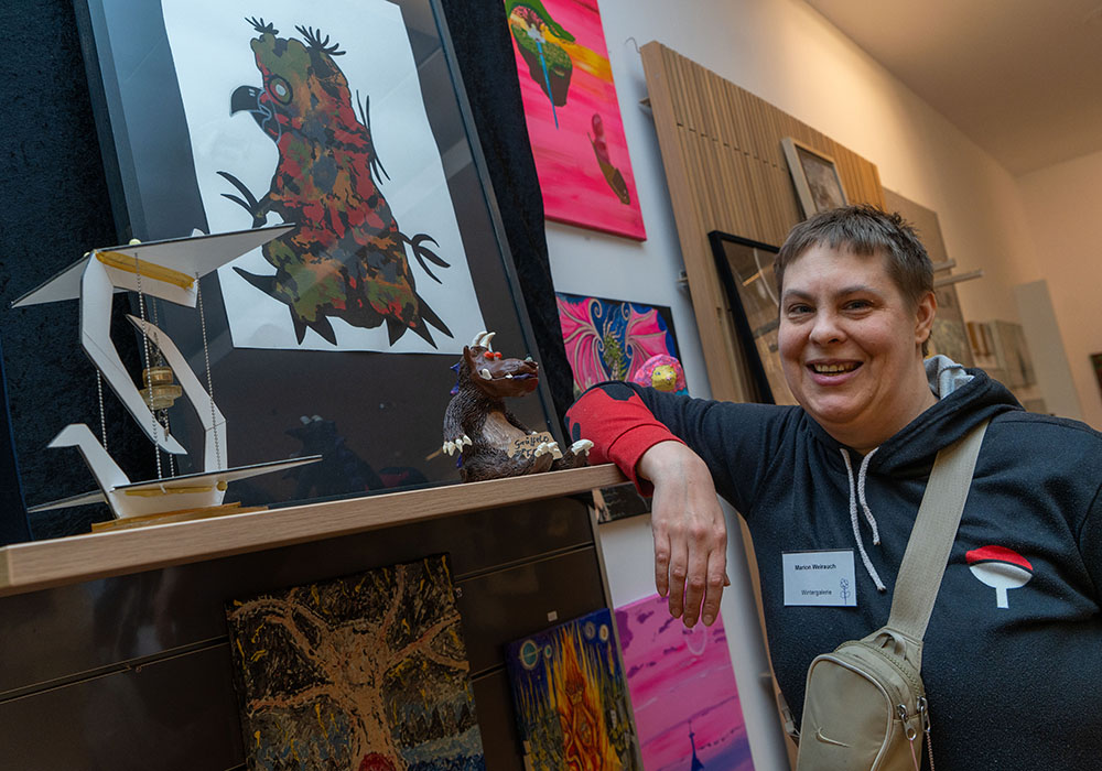 Voraussetzung für das Ausstellen in der Wintergalerie war die Bereitschaft, drei bis vier Schichten in der Woche die Aufsicht zu übernehmen. Und das ist für die Arbeitenden in der AWO-Werkstatt nicht immer einfach. Aber vier von ihnen sind immer dabei.