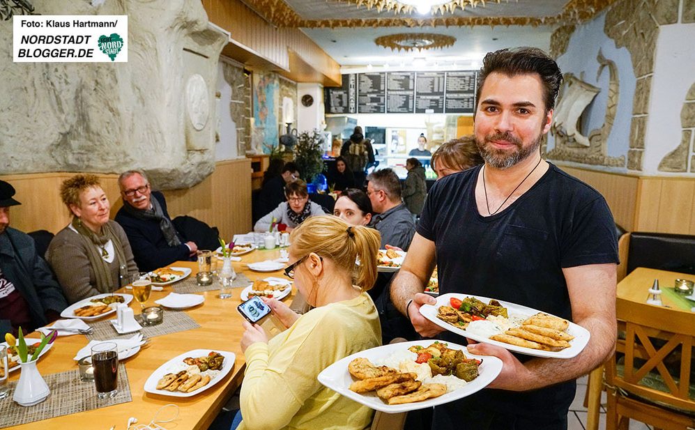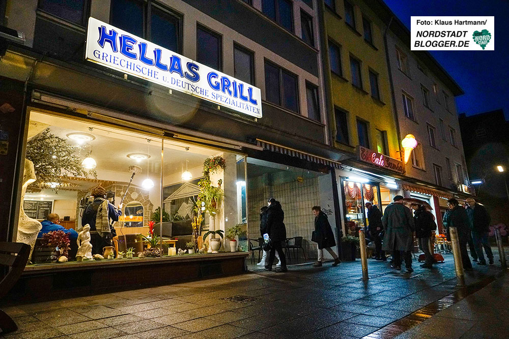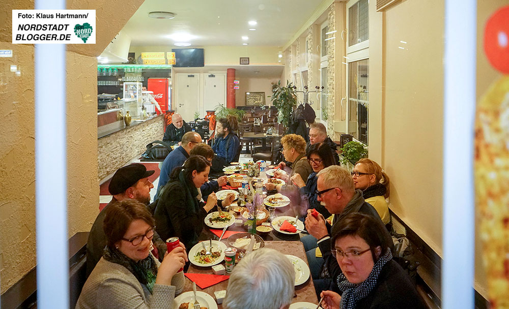 Von der Gneisenaustraße führten Plümpe und Kritzler die Gruppe durch den Blücherpark vorbei an Kunst und künstlerisch gestalteten Fassaden zur Schützenstraße. Im Hellas-Grill erfuhren die Gäste, während sie warmes Pita-Brot mit Auberginenmus und gegrillten Gemüsen speisten, dass die Griechen 1960 nach Deutschland kamen.