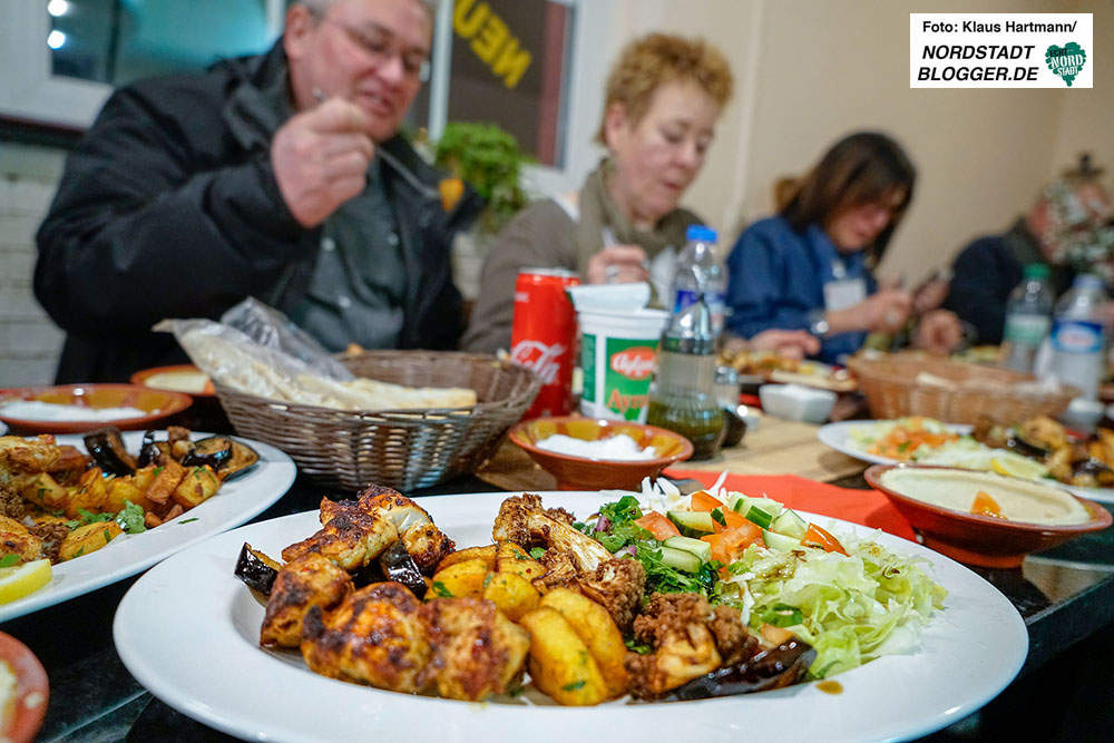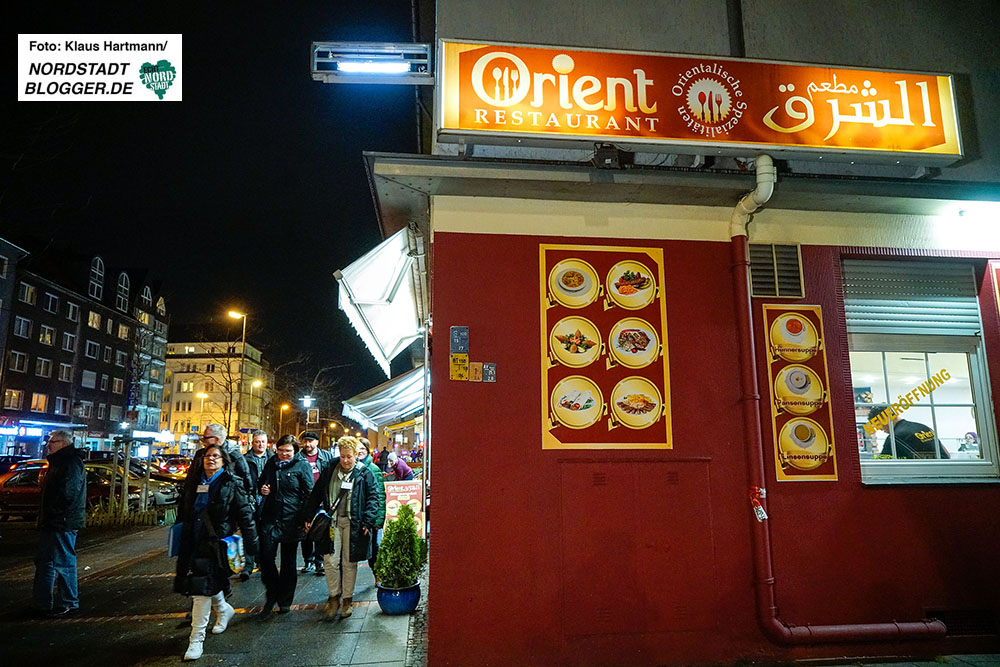 Wer nach der opulenten Vorspeise auf einen Verdauungsspaziergang hoffte, musste den noch verschieben. Nachdem das WDR-Team, das für die Aktuelle Stunde die komplette Tour begleitete, die Aufforderung zum Weitergehen gab, waren es nur wenige Schritte zum Restaurant Orient, wo das syrische Hauptgericht in Vorbereitung war: gegrilltes Hähnchenfleisch mit Bratkartoffeln und geröstetem Blumekohl.