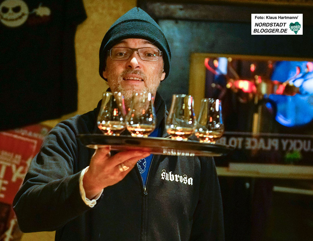 Start des neuen Rundgangs ist die Hafenkneipe Subrosa. Das besondere am Seemannshappen war hier der flüssige Teil. Der Wirt servierte einen acht Jahre alten Rum und reichte dazu Schmalzschnittchen. Anette Plümpe fütterte die Gruppe zur Stadt- und Hafengeschichte sowie zur Geschichte der Arbeitsmigration. „Wo wir jetzt sitzen, ließen 1840 reiche Leute ihr Vieh weiden“, erzählte sie.