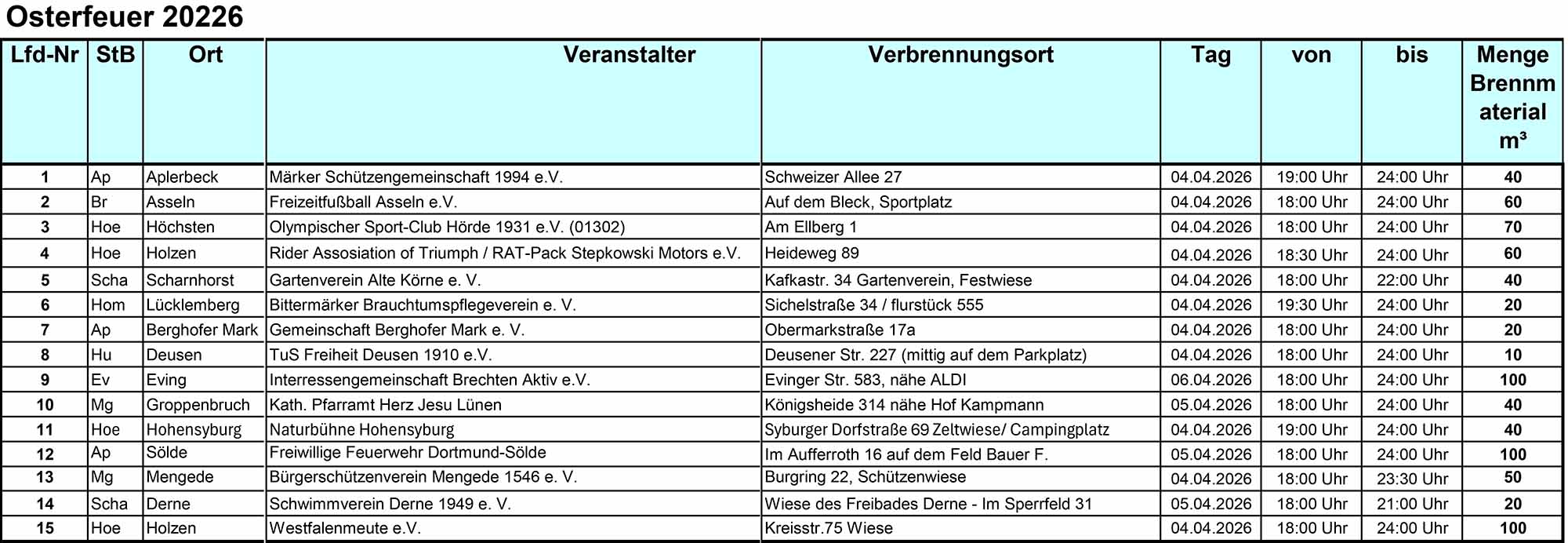 Die Frist zur Anmeldung ist bereits abgelaufen, Nachmeldungen sind ausgeschlossen. Die gemeldeten Veranstaltungen wurden an Feuerwehr, Polizei und die Naturschutzbeauftragten der jeweiligen Bezirke weitergegeben. Damit soll sichergestellt werden, dass die Osterfeuer ordnungsgemäß und sicher stattfinden.