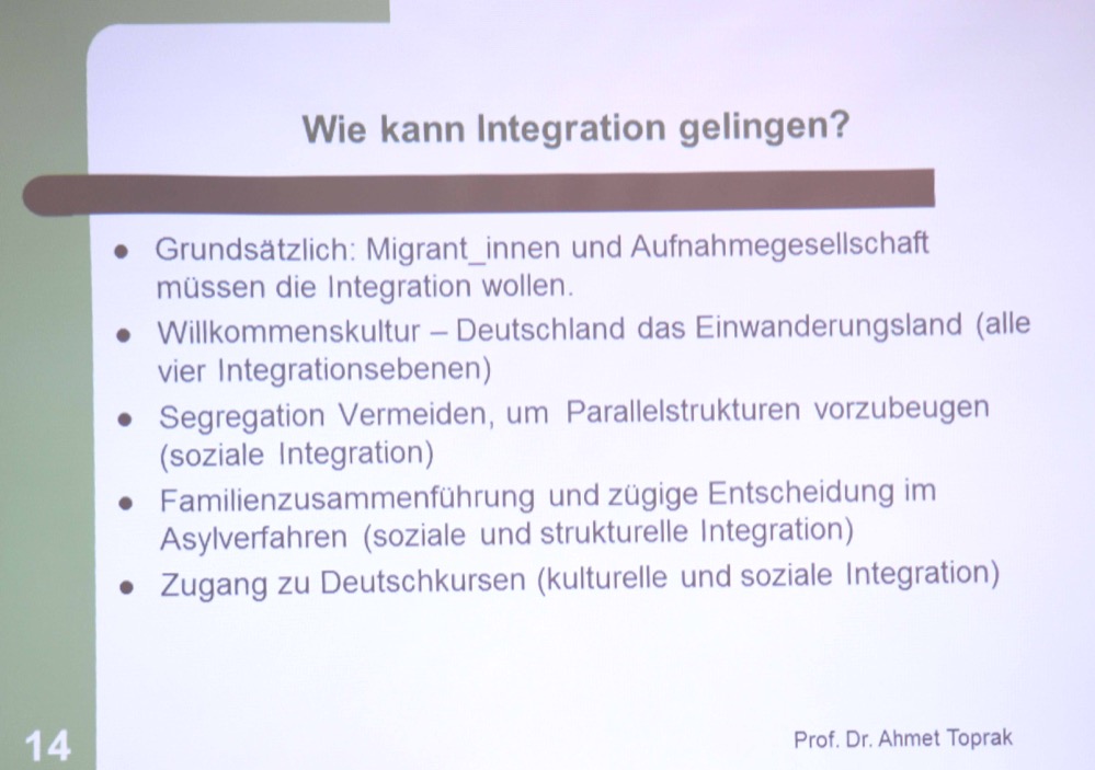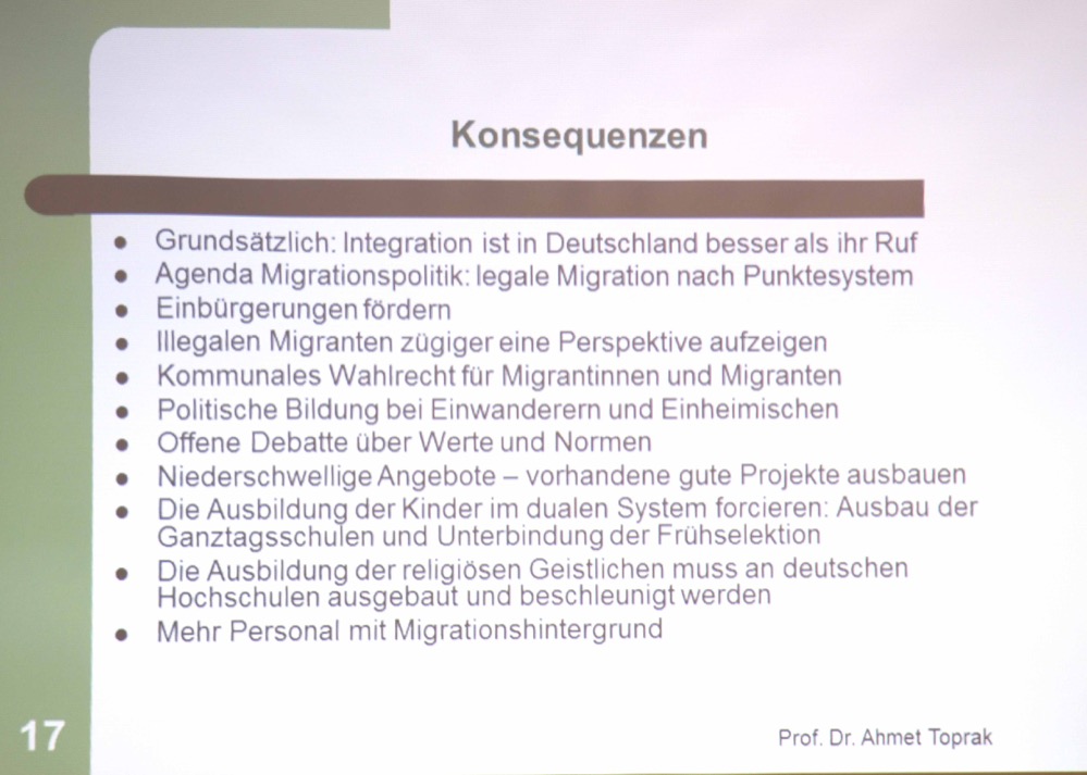 Deutschland solle Einbürgerungen fördern, Illegalen zügiger eine Perspektive bieten und das kommunale Wahlrecht für MigrantInnen einführen. Zudem sei die politische Bildung bei EinwandererInnen und Einheimischen zu intensivieren und eine offene Debatte über Werte und Normen zu führen. Zudem müsste die Ausbildung der Kinder im dualen System forciert, Ganztagsschulen ausgebaut und die Frühselektion von Kindern verhindert werden. Schließlich sollte die Ausbildung der religiösen Geistlichen an deutschen Hochschulen erfolgen.