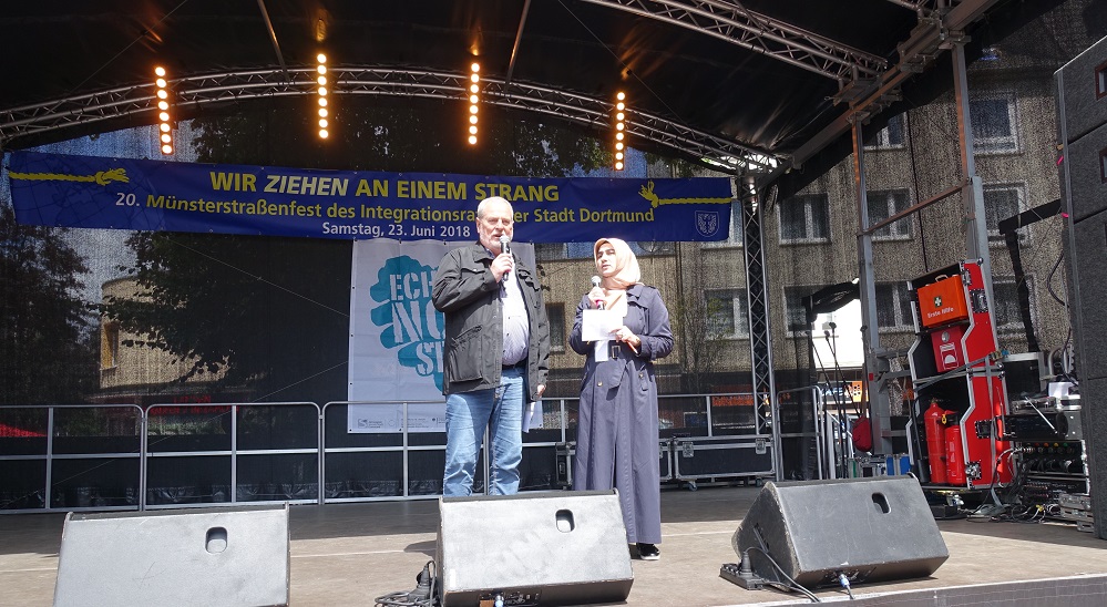 Auf der Hauptbühne führten Fatma Karaca-Tekdemir und Michael Taranczewski durch das vielfältige, kulturelle Programm. Während das Münsterstraßenfest schon im vollem Schwung war, wurde es schließlich um 14 Uhr durch Stadträtin Birgit Zoerner und die Integrationsratsvorsitzende Aysum Tekin auch offiziell eröffnet.