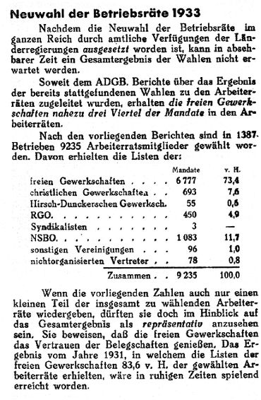Während den Betriebsratswahlen im März 1933 waren die freien Gewerkschaften großen Repressalien ausgesetzt. Die Herausgabe der Gewerkschaftszeitung des ADGB war zum Zeitraum des Wahlkampfes um die Betriebsratsmandate zwischen 18. Februar und 18. März verboten.