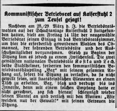 Nachdem die NSBO trotz massiven Einschüchterungsversuchen bei den freien Betriebsratswahlen deutlich in der Minderheit geblieben waren, gingen die Nazis in den Betrieben nun zu offener Gewalt über. So wurden auf den ersten Sitzungen der neu gewählten Betriebsratsgremien die gewählten Vertreter der freien Gewerkschaften mit Gewalt am Antritt ihres Amtes gehindert. In der Morgen-Ausgabe der „Dortmunder Zeitung“ vom 10. April 1933 findet sich ein Artikel, welcher mit unverhohlener Häme berichtet, „der kommunistische Betriebsratshäuptling Bar mit seinem gesamten Anhang“ sei auf der Zeche Kaiserstuhl 2 „zum Teufel gejagt“ worden.