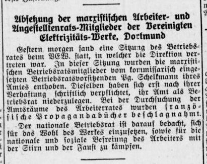 In der Morgen-Ausgabe der Dortmunder Zeitung vom 11. April 1933 lässt sich ein Bericht über die gewaltsame Absetzung und Verhaftung gewählter Betriebsräte bei den Vereinigten Elektrizitätswerken Dortmund nachlesen. Die Räume des Betriebsrats wurden durchsucht und Bücher beschlagnahmt. Die verhafteten Betriebsräte der Vereinigten Elektrizitätswerke wurden nach ihrer Verhaftung – das bedeutet unter Folter – gezwungen, eine schriftliche Verpflichtung über die Niederlegung ihres Amtes abzugeben. Derartige Berichte finden sich beim Durchforsten der in den Anfang April 1933 erschienenen lokalen Zeitungen zuhauf.