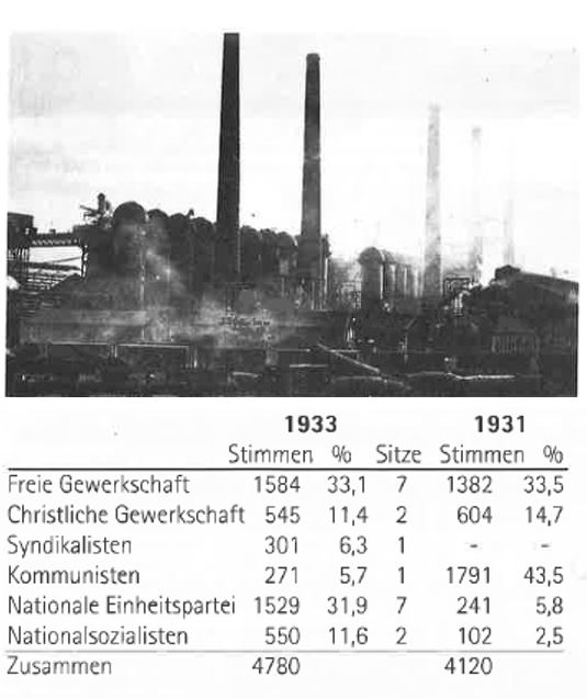 Die Betriebsratslisten der NSBO erhielten lediglich 11,7 Prozent der Stimmen. Bei der Betriebsratswahl im Phoenix-Werk des Hörder Vereins erhielt die Liste des NSBO 12 Prozent, in der Dortmunder Hütte der Union AG für Bergbau, Eisen- und Stahlindustrie erhielt die Liste der NSBO 11,6 Prozent. Mit diesem Ergebnis waren die Nazis weit hinter ihren Erwartungen geblieben. Das Ergebnis verdeutlichte den großen Rückhalt, den die sozialistischen freien Gewerkschaften bei den Industrie-Arbeitern genossen.