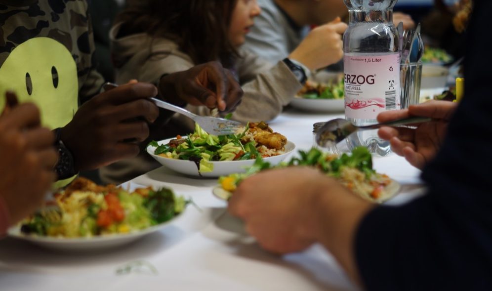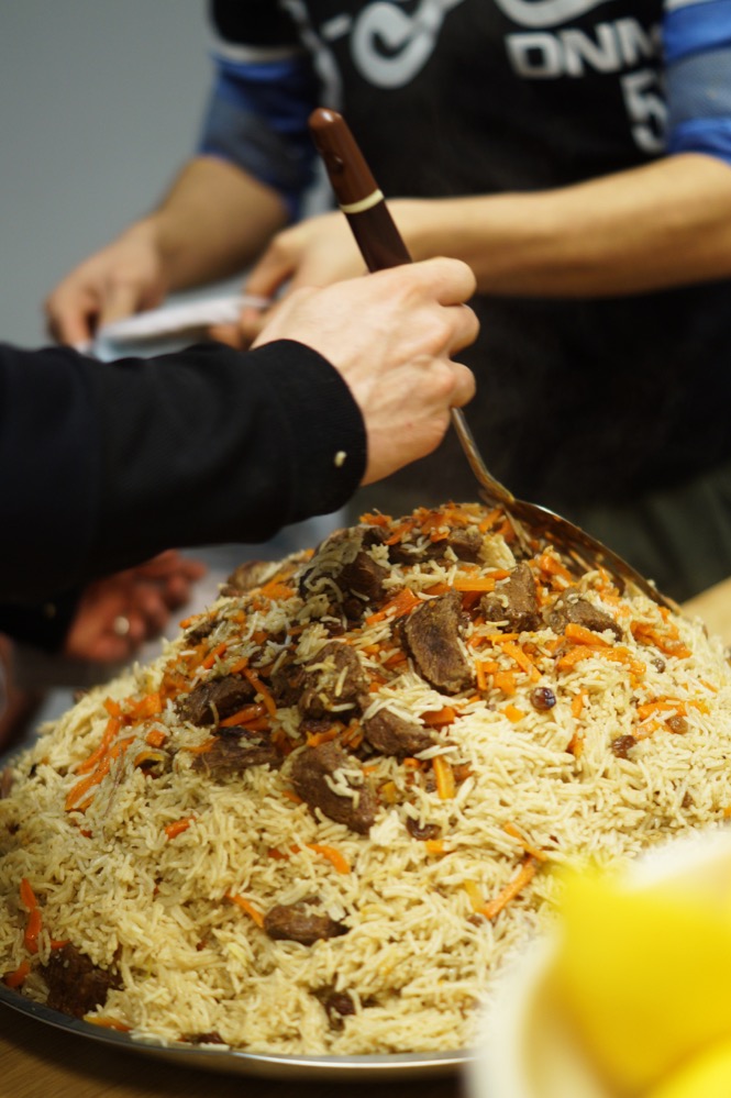 Die Stimmung ist angeregt, alle unterhalten sich miteinander, schaufeln sich Salat und Qaboli Palaw auf ihre Teller. Wenig später sind alle satt und helfen dabei, die Tische umzustellen und neue Sitzmöglichkeiten zu schaffen.