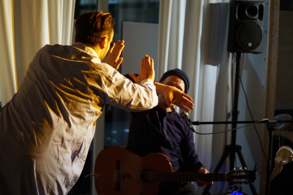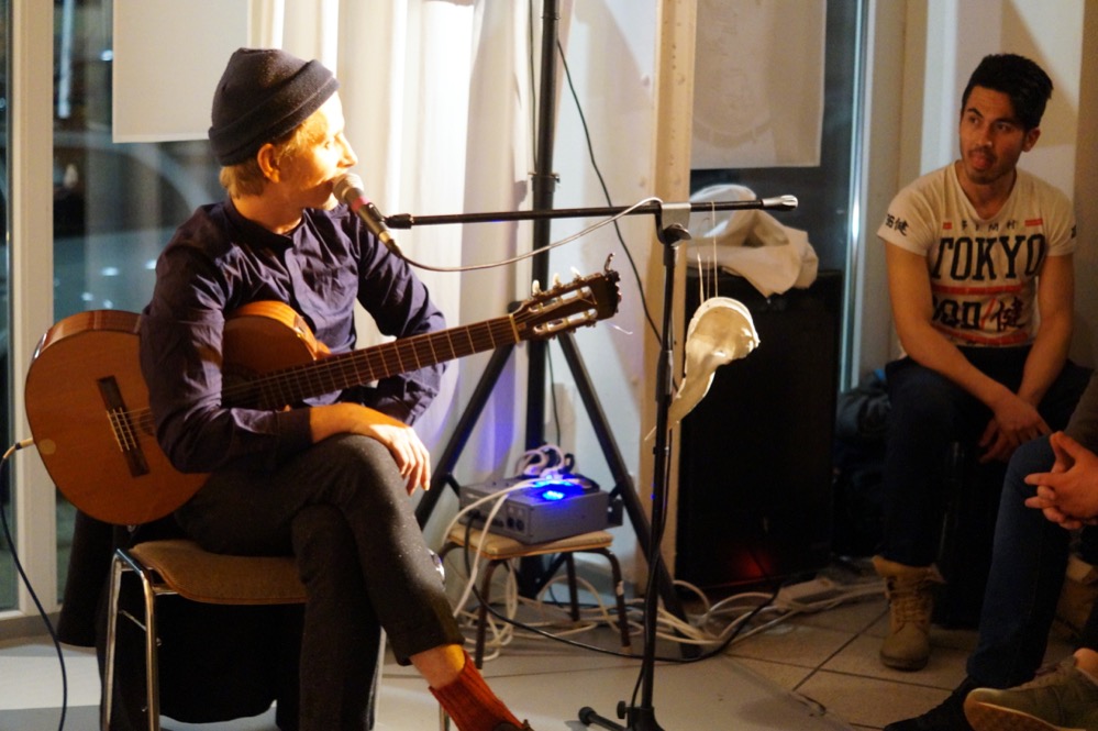 L’esprit du temps, ein Musik-Duo aus Köln, wartet darauf ein Konzert zu geben. Gegen 20 Uhr ist es so weit. Zwei Mikrofonständer sind aufgebaut, eine Gitarre steht auf dem Boden. Auf Bänken, Hockern und dem Boden sitzen Kinder und Erwachsene. Der Raum des Kiosks wird in orangene Farben getaucht. Es folgt Musik, die irgendwo zwischen verträumten französischsprachigem Indie und tanzbaren Reggae-Rhythmen einzuordnen ist. Erlaubt ist, was gefällt. Und das tut es dem Publikum. Was als ruhiges Konzert beginnt, entwickelt sich später zu einer Jamsession, zu der jeder mittanzt.