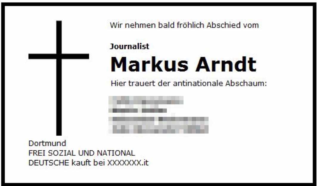 Marcus Arndt ist einer von fünf Dortmunder Journalisten, die in fingierten Todesanzeigen der Neonazis erwähnt werden: „Nach seinem hoffnungslosen Kampf gegen Nationale Aktivisten bedeutet sein baldiger Tod mehr als eine Erlösung für uns alle“ stand in einer „seiner“ Todesanzeigen.