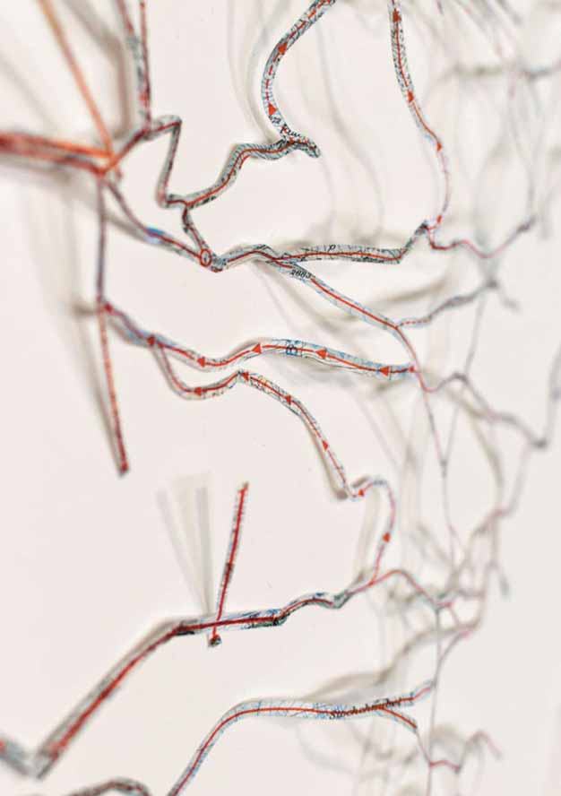 Mit Zeichnungen, Papierschnitt und in Installationen macht sie auf diese Weise die Konstruiertheit der untersuchten Systeme sichtbar und verleiht den einzelnen Elementen eine eigene Bedeutung. In ihrer Einzelausstellung zeigt sie im Oberlichtsaal des „U“ auch Werke, die in dieser Form noch in keiner Ausstellung zu sehen waren.