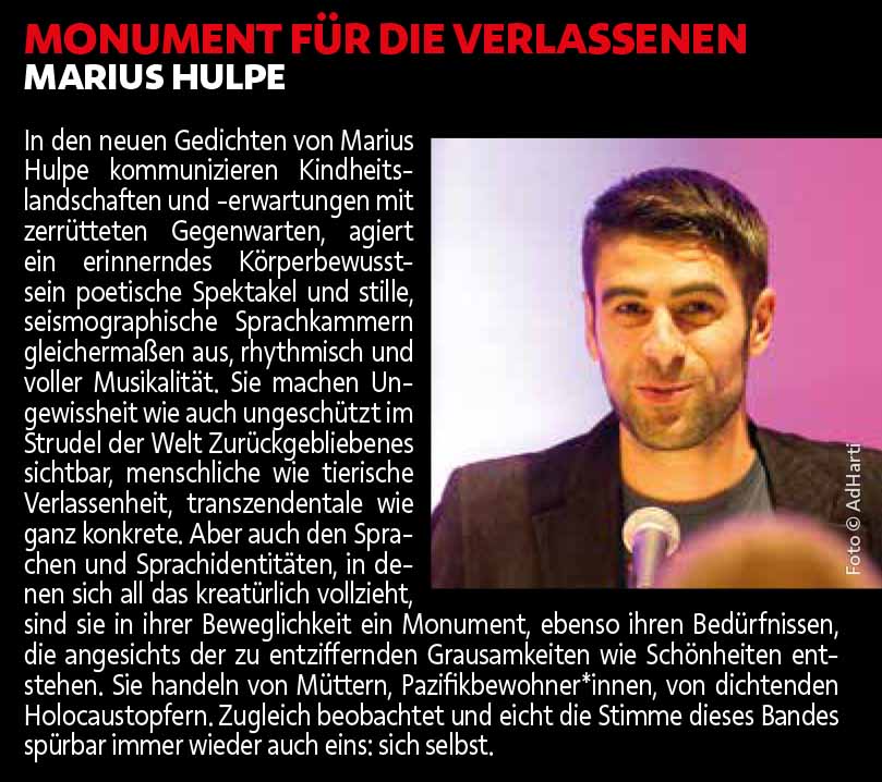 In den neuen Gedichten von Marius Hulpe (Jahrgang 1982) unter dem Titel „Monument für die Verlassenen“ kommunizieren Kindheitslandschaften und -erwartungen mit zerrütteten Gegenwarten, rhythmisch und voller Musikalität. Sie machen Ungewissheit wie auch ungeschützt im Strudel der Welt Zurückgebliebenes sichtbar, menschliche wie tierische Verlassenheit, transzendentale wie ganz konkrete. Sie handeln von Müttern, Pazifikbewohner*innen, von dichtenden Holocaustopfern. Zugleich beobachtet und eicht die Stimme dieses Bandes spürbar immer wieder auch eins: sich selbst.