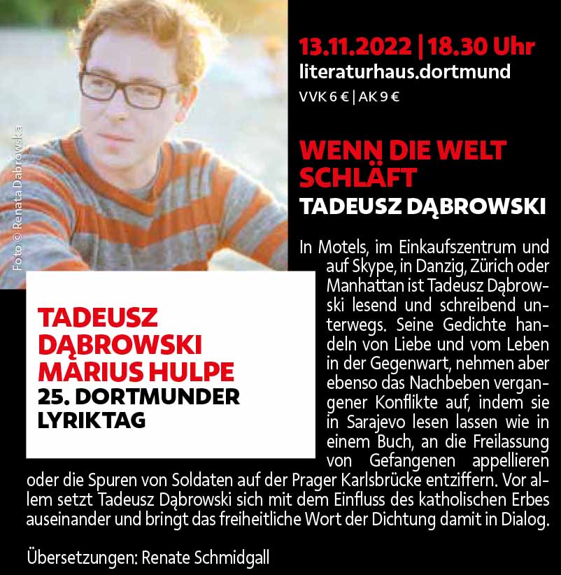 Am Sonntag, 13. November endet das LesArt.Festival Dortmund mit dem 25. Dortmunder Lyrik-Tag: Im literaturhaus.dortmund (Neuer Graben 78) präsentieren der polnische Lyriker Tadeusz Dąbrowski und Marius Hulpe ab 18.30 Uhr ihre Gedichte. Der Eintritt kostet im Vorverkauf 6 Euro, an der Abendkasse 9 Euro. Tickets: http://www.lesart.ruhr