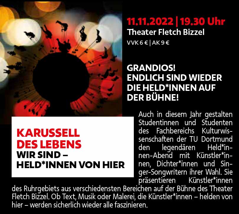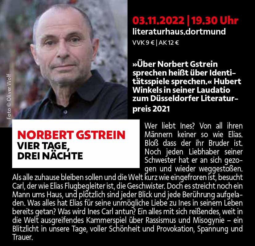 Der literarische Herbst hat begonnen: Am Donnerstag, 3. November startet das LesArt.Festival Dortmund. Bis zum 13. November präsentieren Autor*innen an ganz unterschiedlichen Orten in Dortmund ihre Geschichten, Gedichte – und sich selbst. Los geht es am Donnerstag, 3. November, 19.30 Uhr mit Norbert Gstrein: Im literaturhaus.dortmund (Neuer Graben 78) liest er aus seinem jüngst erschienenen Roman „Vier Tage, drei Nächte“. Der Eintritt kostet im Vorverkauf 9 Euro, an der Abendkasse 12 Euro. Tickets: http://www.lesart.ruhr