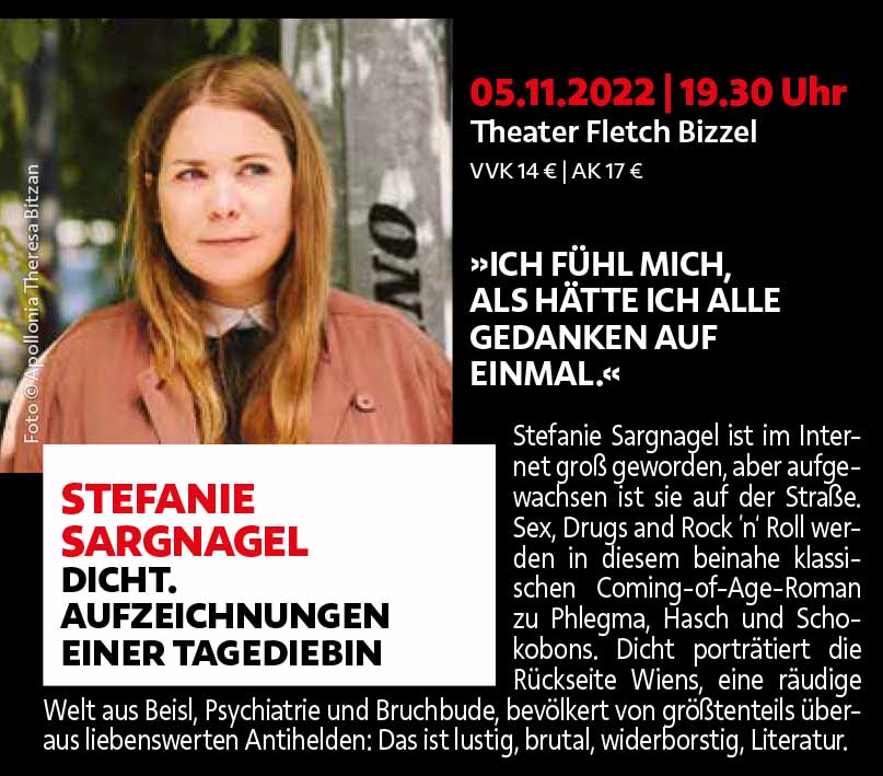 Im Theater Fletch Bizzel erzählt Stefanie Sargnagel ebenso brutal wie lustig von den Antihelden Wiens (5.11.), während ihr Landsmann Norbert Gstrein seinen jüngsten Roman „Vier Tage, drei Nächte“ vorstellt (3.11., literaturhaus.dortmund).
