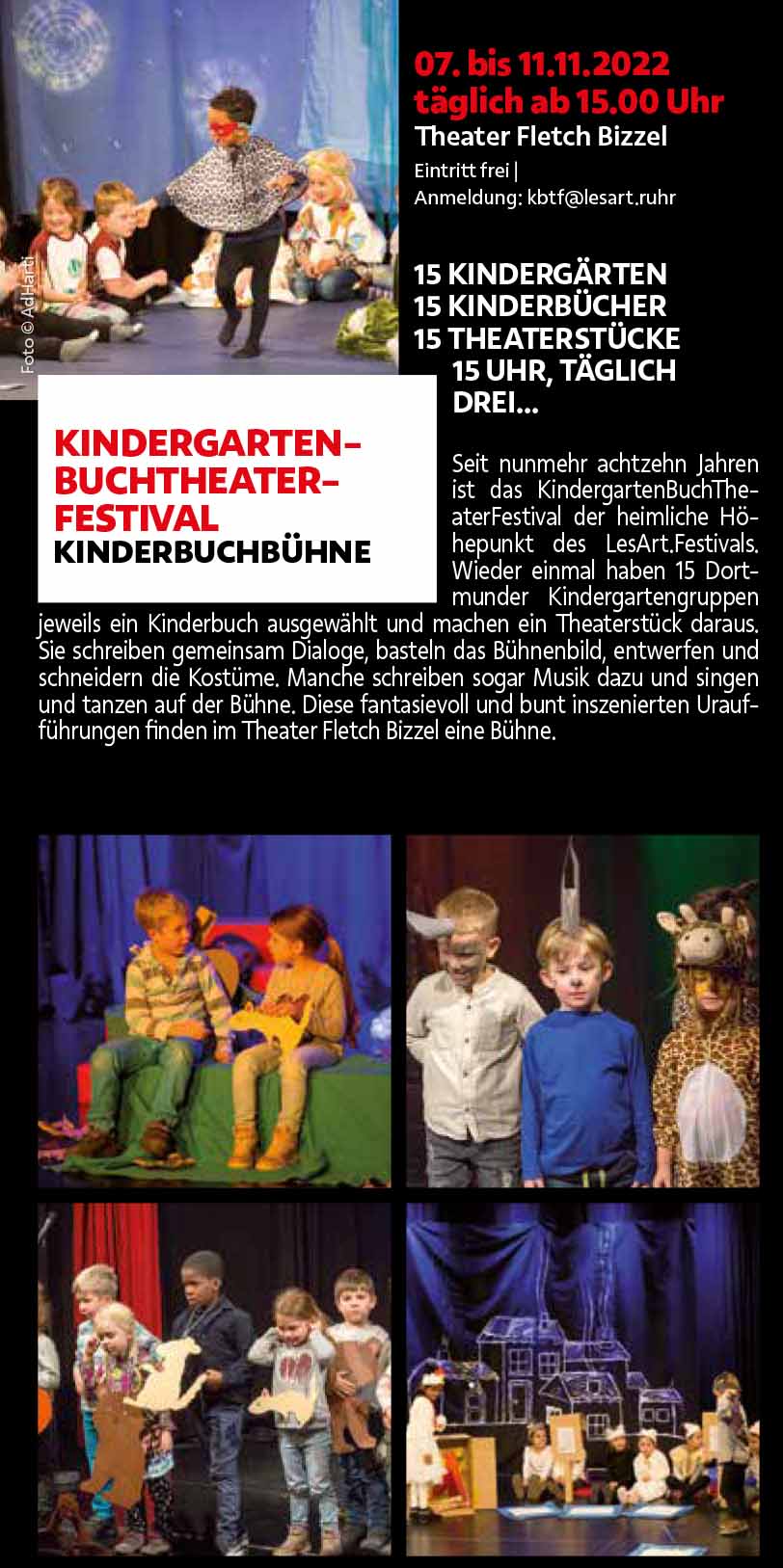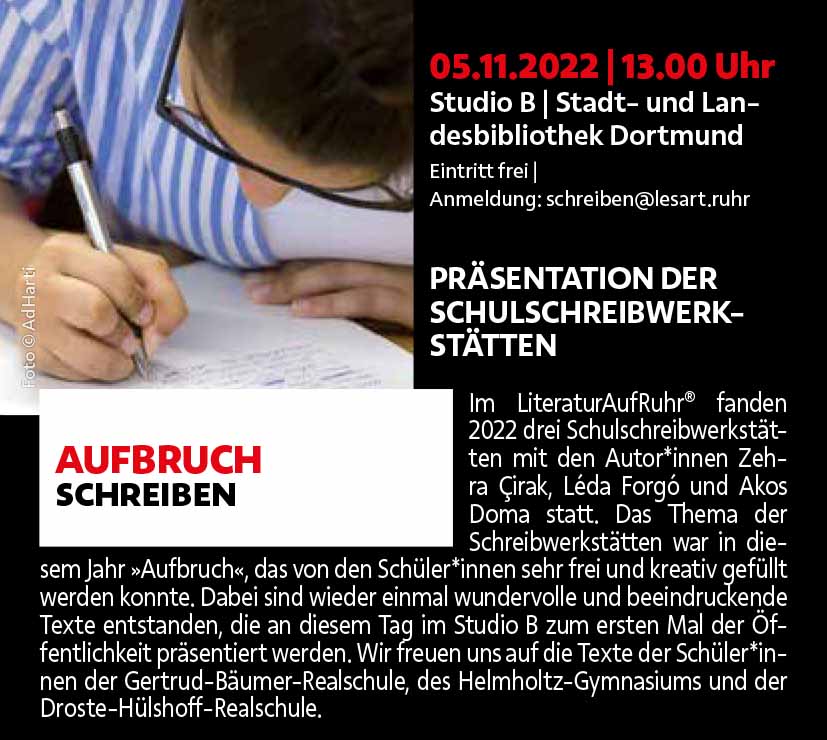 Veranstalter von LesArt. ist der Verein Kultur und Projekte mit dem Kulturbüro Dortmund und der Stadt- und Landesbibliothek. Das Festival wird von der Sparkasse Dortmund gefördert. Das komplette Programm: lesart.ruhr