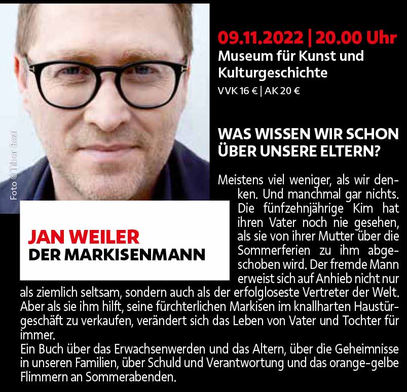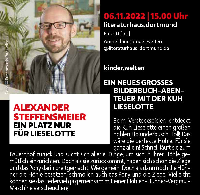 Im Museum für Kunst und Kulturgeschichte liest Jan Weiler aus „Der Markisenmann“ (9.11.), und Kinderbuch-Autor Alexander Steffensmeier zeigt in seiner Bilderbuch-Lesung live, wie „Ein Platz nur für Lieselotte“ entsteht (6.11., literaturhaus.dortmund).