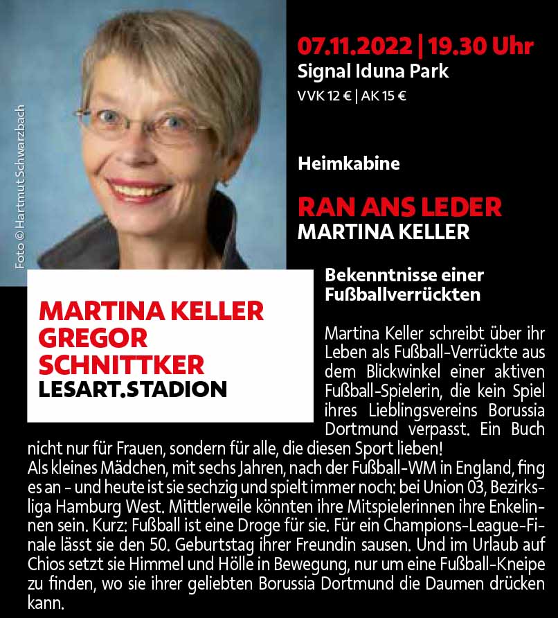 Auch der Signal Iduna Park ist wieder Spielort der LesArt: Am 7. November gibt es in der Heim- sowie in der Gästekabine ausgewählte Fußball-Literatur von Martina Keller und Gregor Schnittker zu hören.