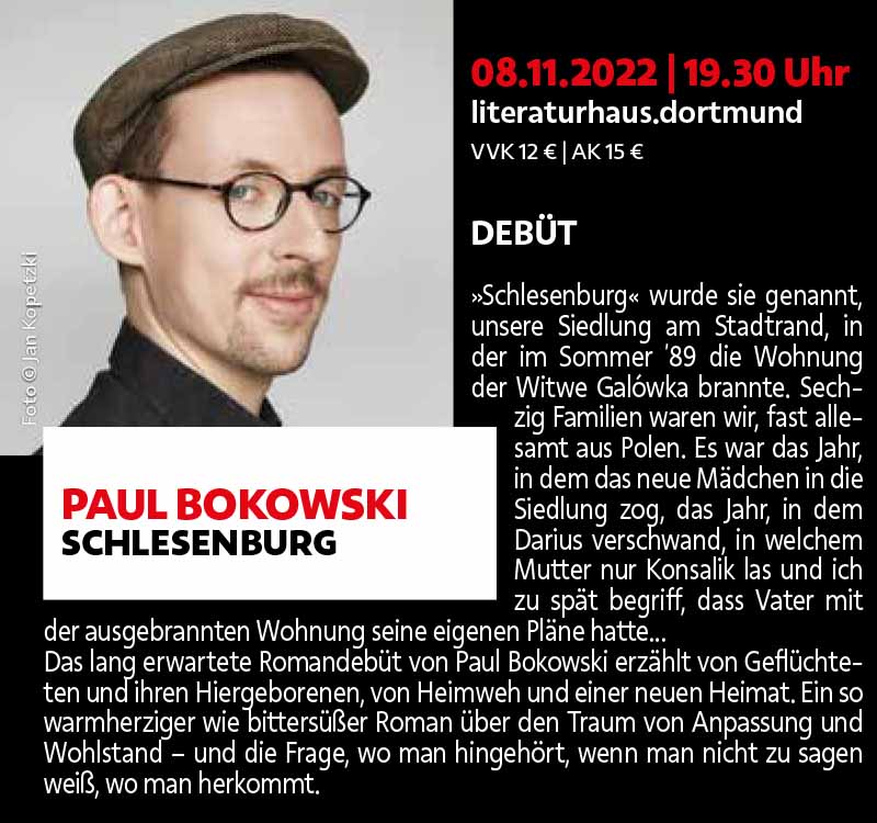 Morgen (3. November) startet das LesArt.Festival Dortmund. Bis zum 13. November präsentieren Autor*innen an unterschiedlichen Orten in Dortmund ihre Geschichten, Gedichte – und sich selbst. Am Dienstag, 8. November, 19.30 Uhr stellt Paul Bokowski seinen Debütroman „Schlesenburg“ im literaturhaus.dortmund (Neuer Graben 78) vor. Der Eintritt kostet im Vorverkauf 12 Euro, an der Abendkasse 15 Euro. Tickets: http://www.lesart.ruhr