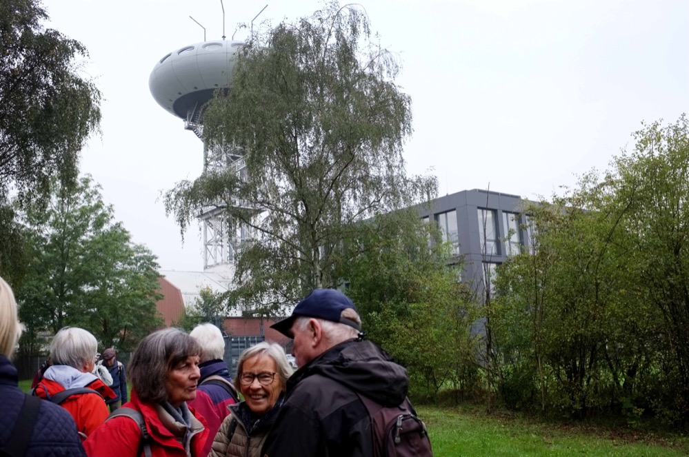 In Lünen taten sie eine andere Lokalität auf, die Strecke blieb im Programm. Von der Endhaltestelle Brambauer geht es durch ein Wohngebiet auf einen Fußweg, der zum Colani-Ei führt, eine phantasievolle Gestaltung eines ehemaligen Fördergerüsts der Zeche Minister Achenbach nach einer Skizze des Designer Luigi Colani. Über die Kanalbrücke geht’s durchs Industriegebiet Richtung der Schlossmühle Buddenburg. Picknickpause. Die Wander*innen holen meist Obst und Getränke aus den Rucksäcken und freuen sich aufs warme Mittagessen.