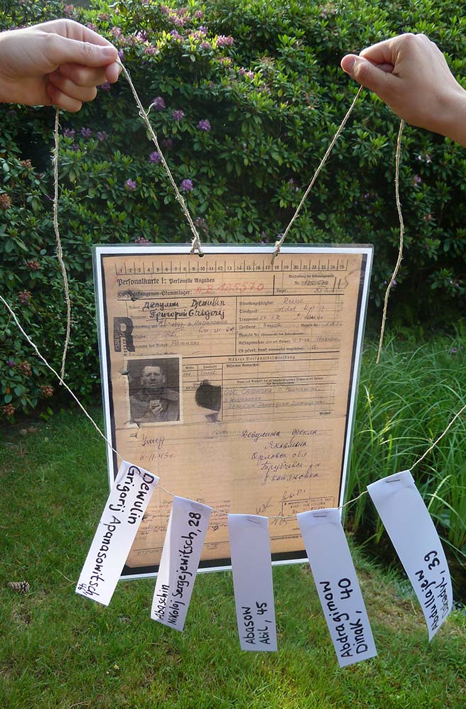 Mit Hilfe der Kirchentagsbesucher sollen kleine Bänder mit dem Namen und dem Alter der 4.408 sowjetischen Kriegsopfer beschrieben werden, die auf dem Dortmunder Hauptfriedhof beigesetzt sind und deren Daten bekannt sind. Hierfür benötigen wir noch viele helfende Hände. Gerne können auch mehrere Namensschilder von einer Person beschrieben werden. Unseren Stand finden Sie in Halle 4, Nr. B 24. Die Namensbänder können während des Marktes der Möglichkeiten, 20.-22. Juni, 10.30-18.30 Uhr, an unserem Stand beschrieben werden. Die Bänder sollen im Nachgang zum Friedensgebet am 22. Juni aufgehängt werden.