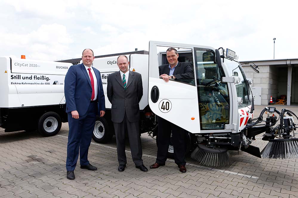„Wir freuen uns“, so die EDG-Geschäftsführer bei der Vorstellung der Elektro-Kleinkehrmaschinen, „dass wir gerade beim Evangelischen Kirchentag, der sich auch mit den Themen Umwelt, Klima und Nachhaltigkeit auseinandersetzt, zeigen können, dass wir als kommunales Unternehmen unserer Ver- antwortung für den Klimaschutz gerecht werden. Wir befassen uns daher auch mit alternativen An- triebstechniken, um diese, wo es heute schon möglich ist, einzusetzen.“