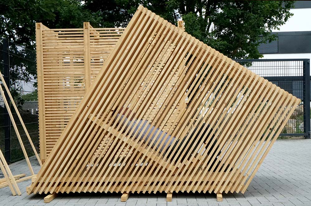 Die Mittel waren reduziert: Maximal 420 laufende Meter Dachlatten konnten die Studierenden für jeden Raum verbauen, als Verbindungselemente waren nur Schrauben in zwei verschiedenen Längen zugelassen. Um als Andachtsraum zu funktionieren, sollten die Entwürfe „möglichst viele Sinne ausschalten, damit man sich auf sich selbst konzentrieren kann“, erläutert Prof. Ralf Dietz.