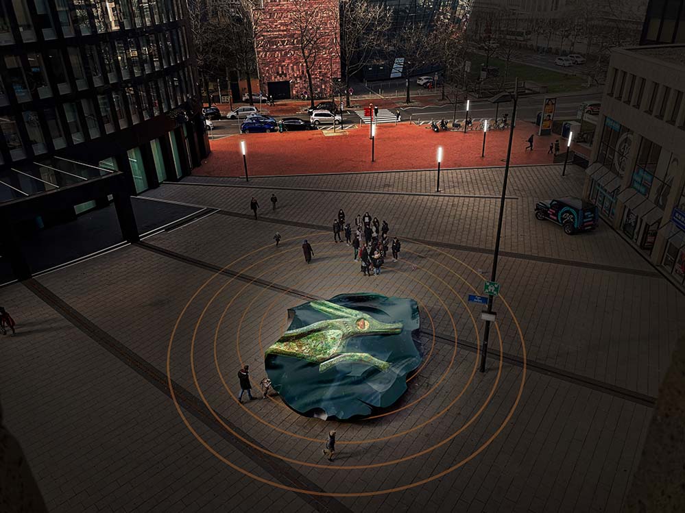 Bildzeile: Eine Visualisierung der Video-Klang-Installation AXIS 1.0, projiziert auf Stefan Sous‘ Skulptur „Chip“ auf dem Platz von Amiens.