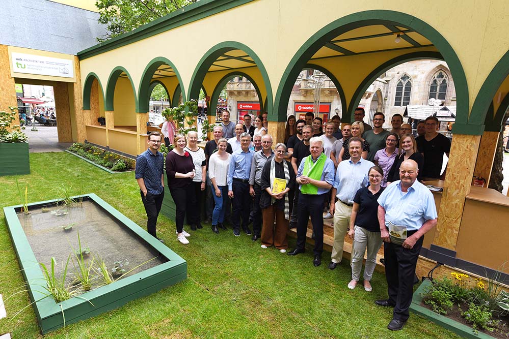 Dortmunds Oberbürgermeister Ullrich Sierau (4.v.r.) und Prof. Barbara Welzel (5.v.r.) und Bauherr Michael Küstermann eröffneten mit vielen Beteiligten das „stadt paradies sanktreinoldi“.