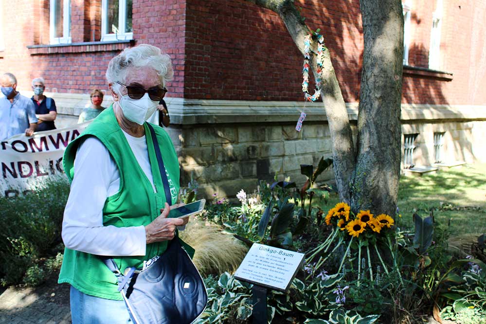 Dr. Hida starb 2017 hundertjährig. Von ihm stammt auch der Gingkobaum, welchen er der Stadt Dortmund 1988 geschenkt hatte. Was er am 6. August 1945 als Militärarzt erlebt hat, sei ihm zum Schlüsselerlebnis geworden, erzählte Schlütermann. Hida war auf Opfer mit schlimmen Verbrennungen, die faulig aus dem Mund rochen und aus Nase und Augenlidern bluteten. Folgen der akuten Strahlenkrankheit. Yoko Schlütermann: „Wir müssen jetzt sofort handeln und Atomwaffen stoppen!“