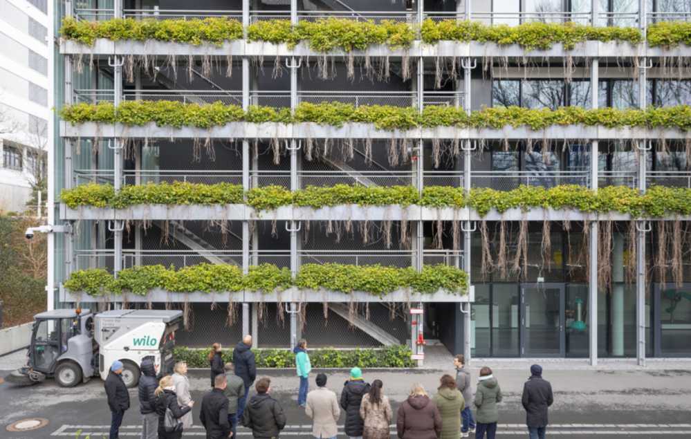 Das Unternehmen Wilo hat an seinem Konzernsitz in Dortmund einige Schwammstadt-Maßnahmen umgesetzt. Darunter zum Beispiel auch eine Fassadenbegrünung. Foto: Stefan Tuschy / EGLV