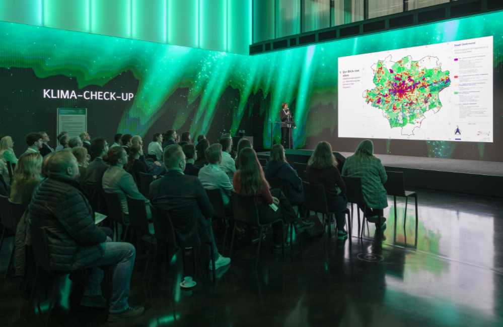 Dass der Veranstaltungsort bewusst gewählt war, zeigte ein Blick auf das Firmengelände von Wilo. Dort wurden bereits verschiedene Bausteine der Klimaanpassung umgesetzt, darunter Dach- und Fassadenbegrünungen, ein Regenrückhaltebecken, Rigolen zur Speicherung von Niederschlägen sowie die Nutzung von Regenwasser, etwa für die Toilettenspülung.