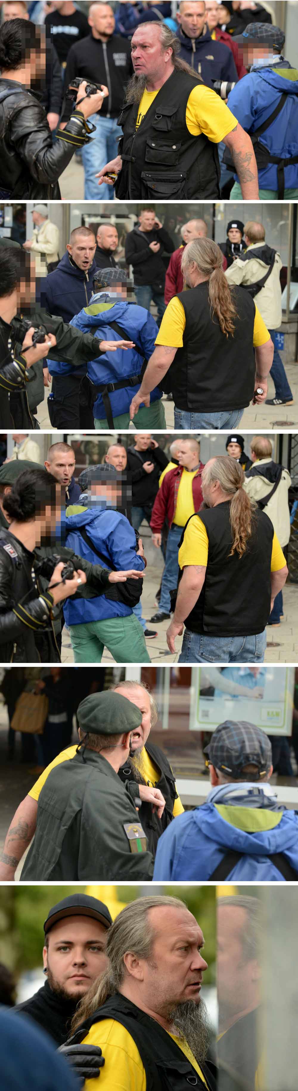Auf den Bildern ist zu sehen, wie ein Polizist den Neonazi abdrängt, der einen Fotografen bedroht hat. Die Bilder machen insgesamt das aggressive Verhalten der Neonazis und das Mitführen des Pfeffersprays deutlich.