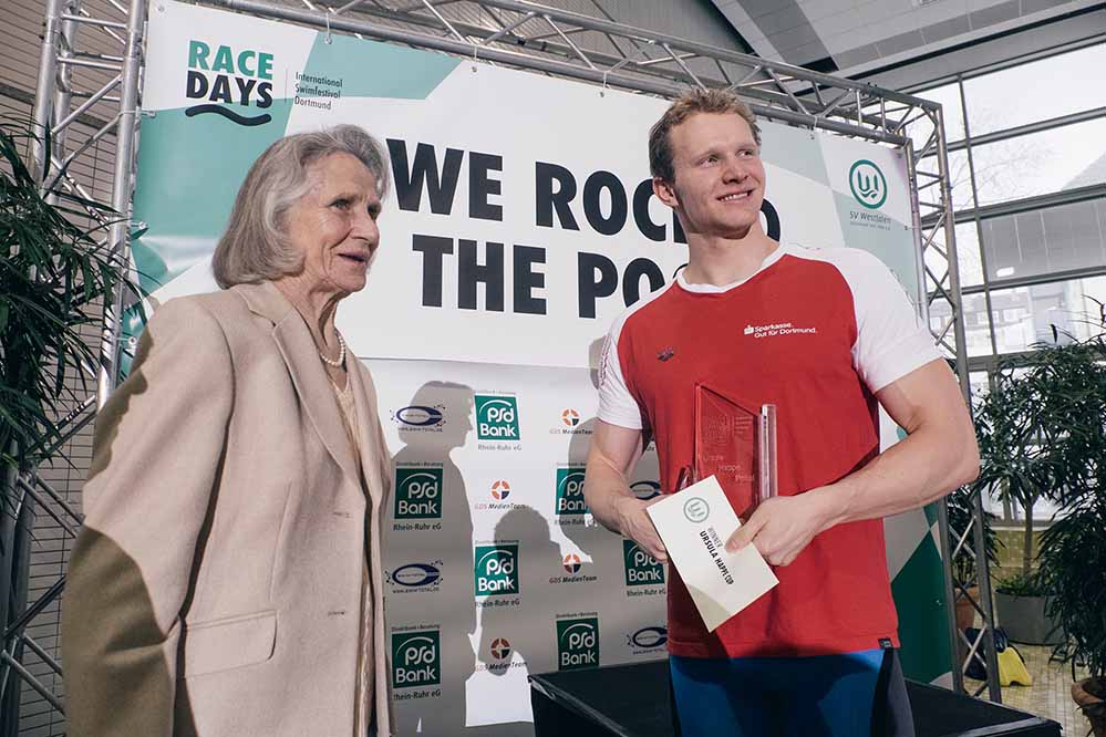 Am Sonntag geht es für die Aktiven vor allem um die besten Gesamtleistungen. Die Brustspezialisten schwimmen um den Ursula-Happe-Pokal, den die Olympiasiegerin von 1956 und Mitglied des SV Westfalen gegen 16 Uhr persönlich überreichen wird.