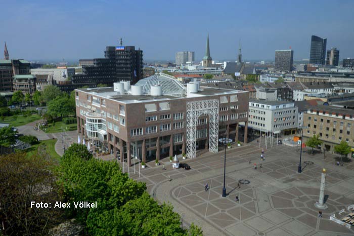Stadtansicht Rathaus Dortmund mit Friedensplatz und City-Skyline. Foto: Alex Völkel