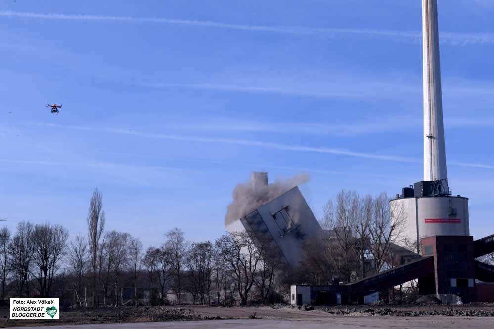 Um 12.10 Uhr folgte die zweite Sprengung. Kühlturm und Schornstein kamen dabei mit einigen Sekunden Abstand zu Fall. Dank rund 60 Kilo gelatinösem Sprengstoff, der in rund 900 Bohrlöchern versenkt wurde und mit Unterstützung von Kippgelenken zur Richtungspräzision, lag der Schornstein nach gut 12 Sekunden genau an der dafür vorgesehenen Stelle.